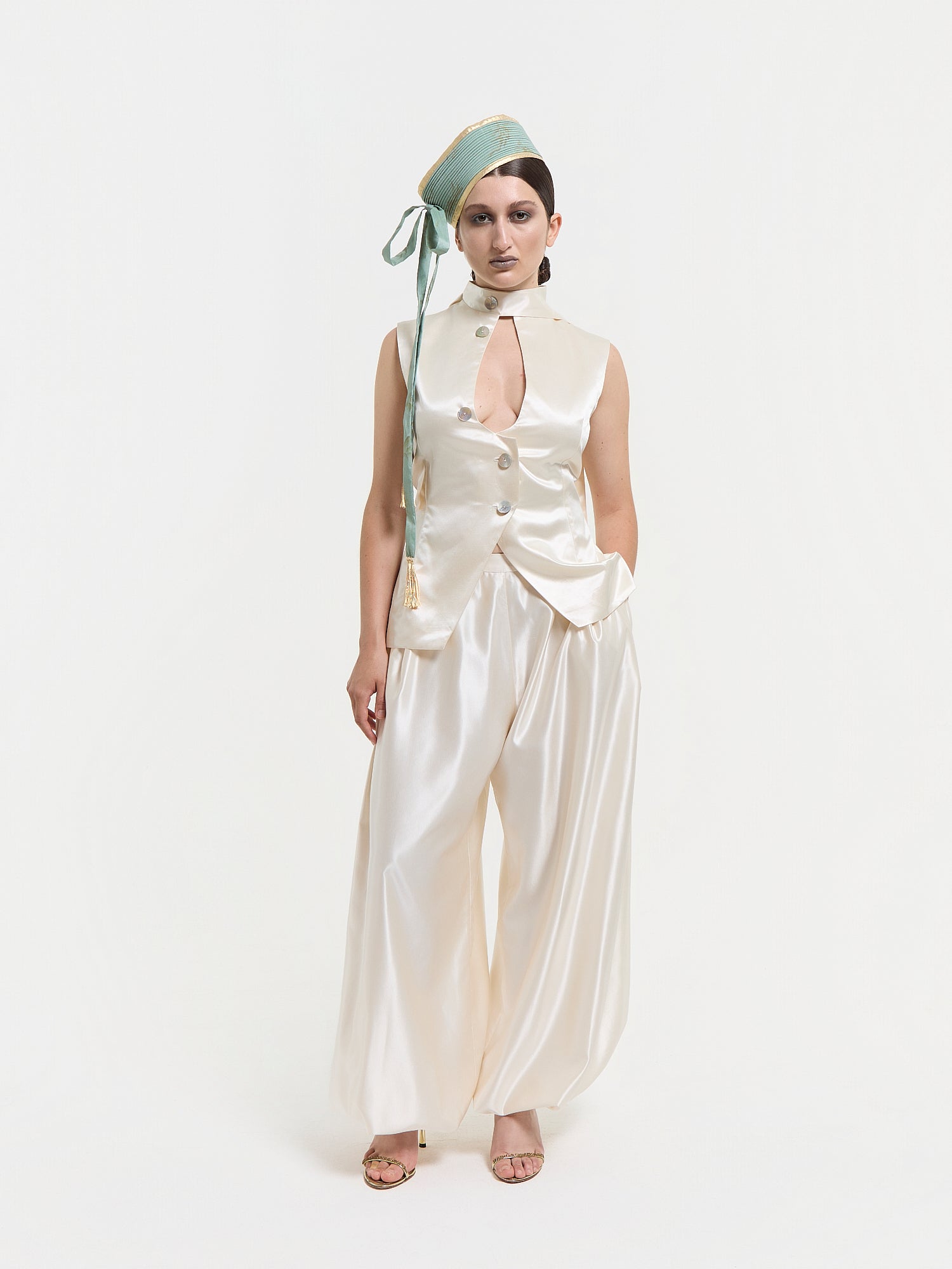 - • Balloon shaped trousers, pleated on top and at the hem