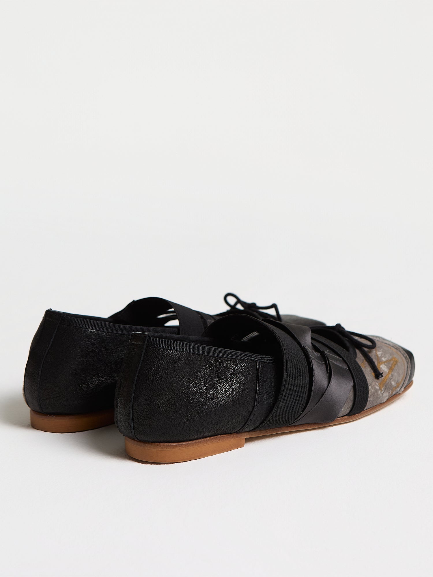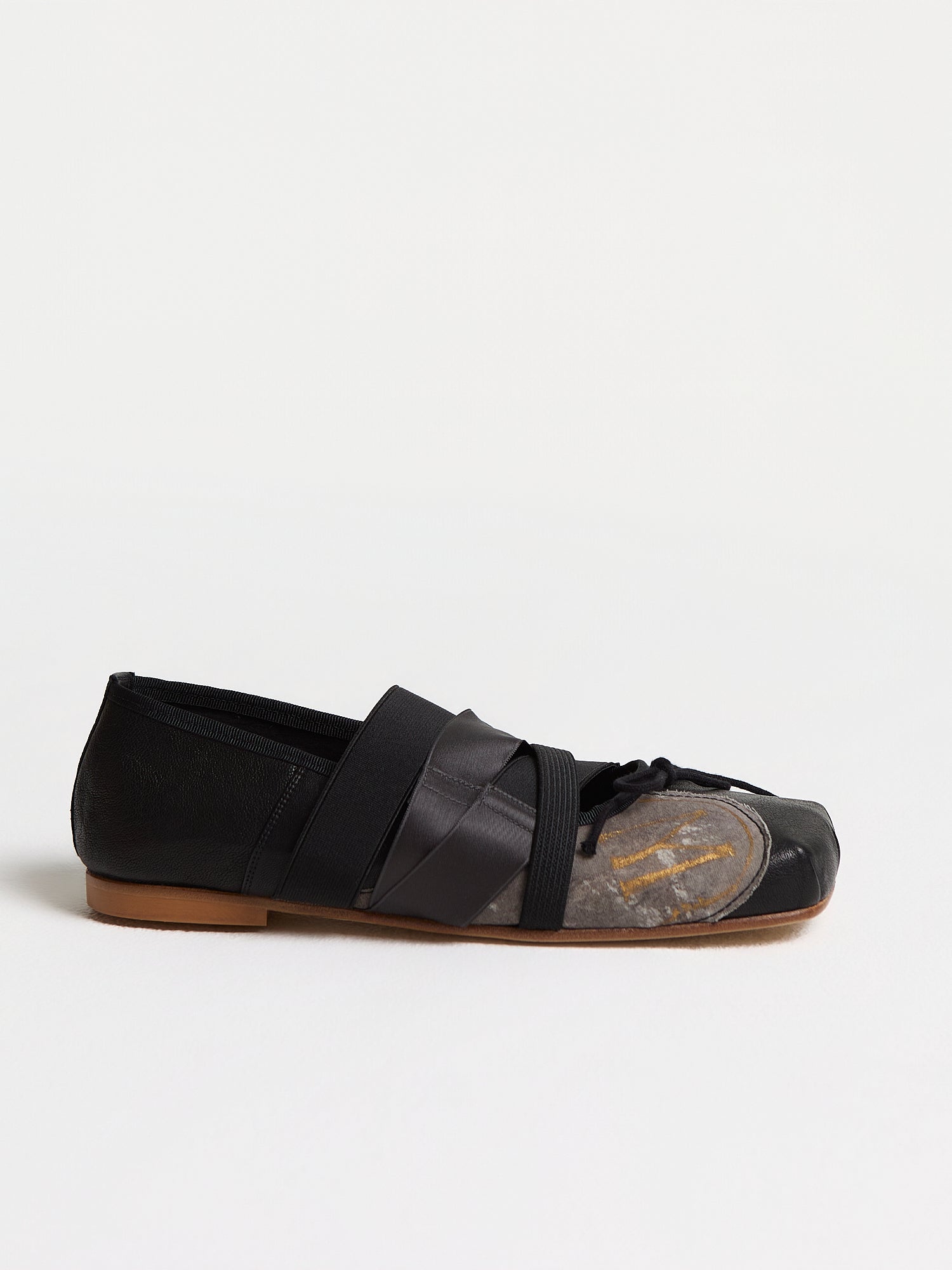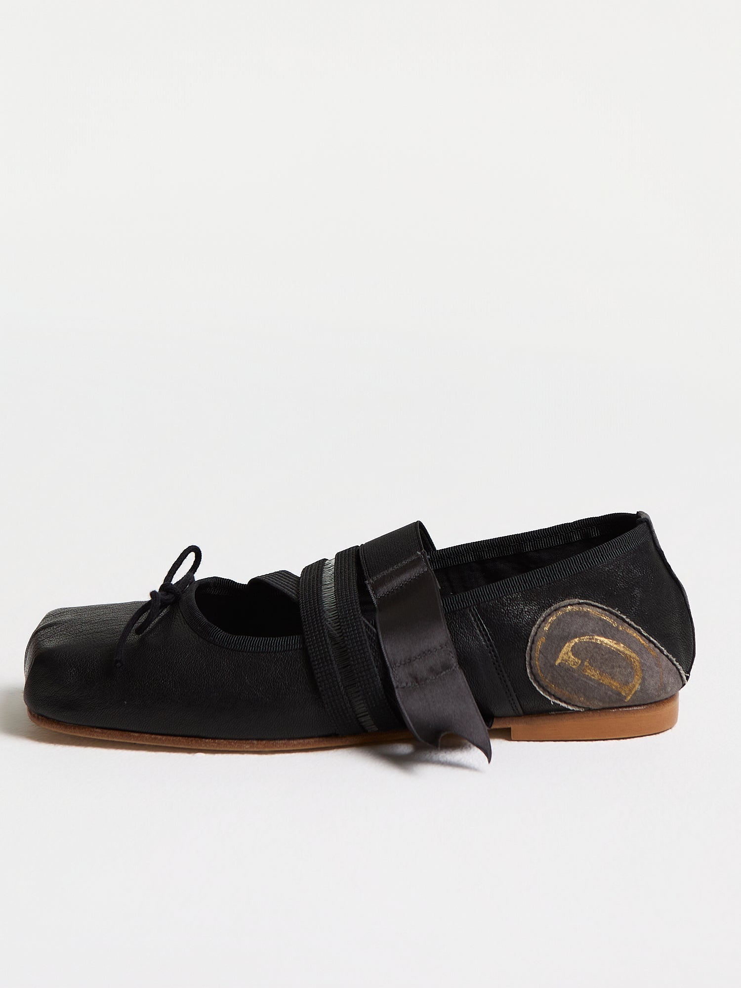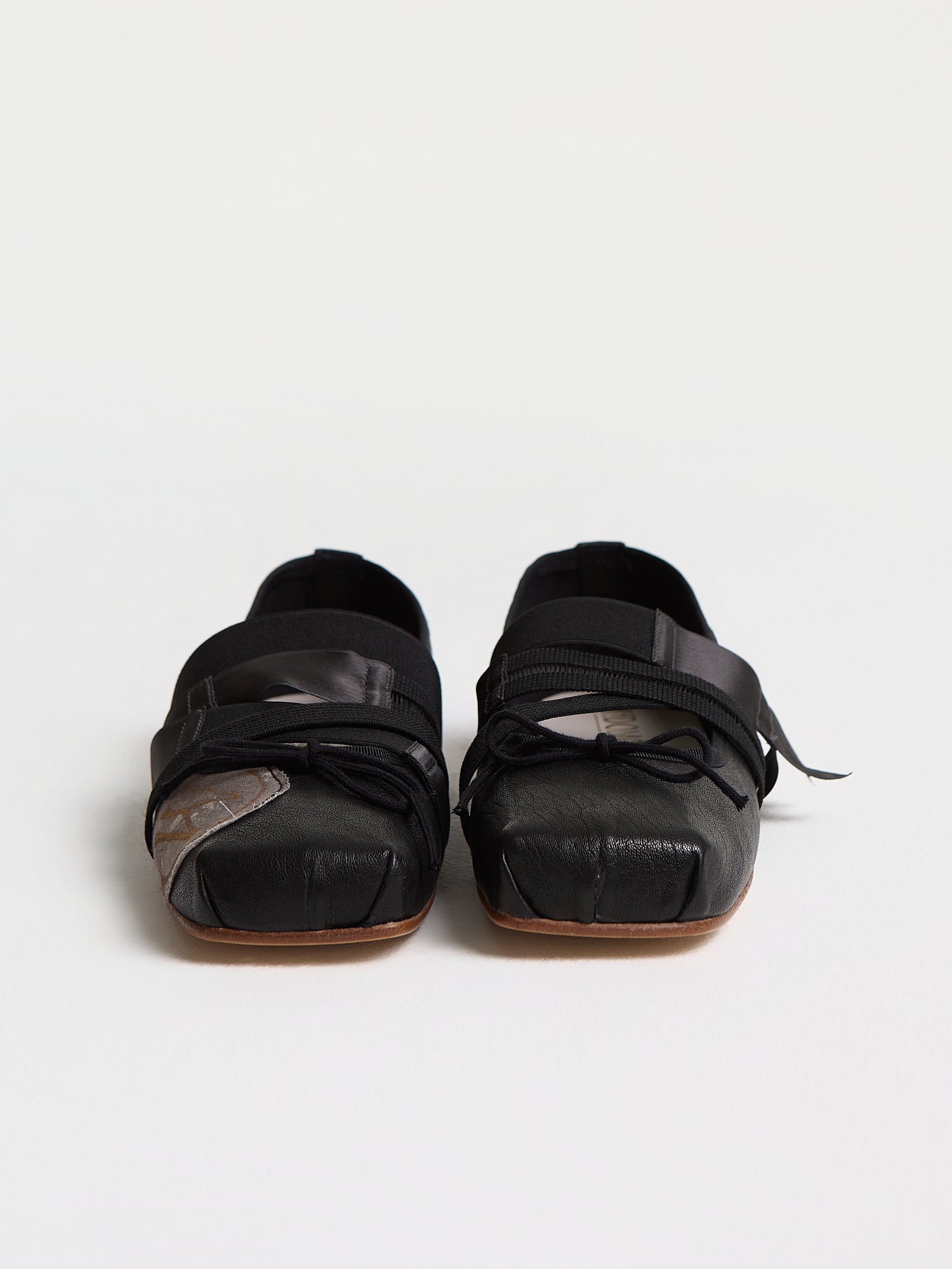 The Madomorpho Ballet Flats are inspired by ballet pointe shoes that are stored, with ribbons wrapped around the flats and have a decorative canvas sole stitched on.