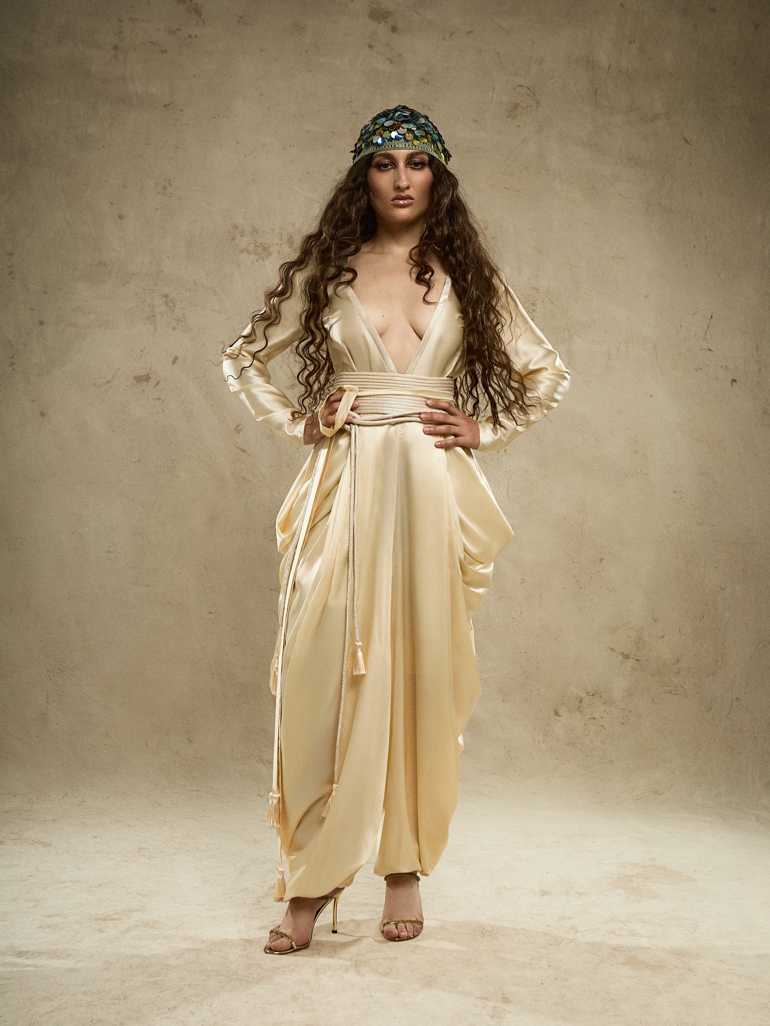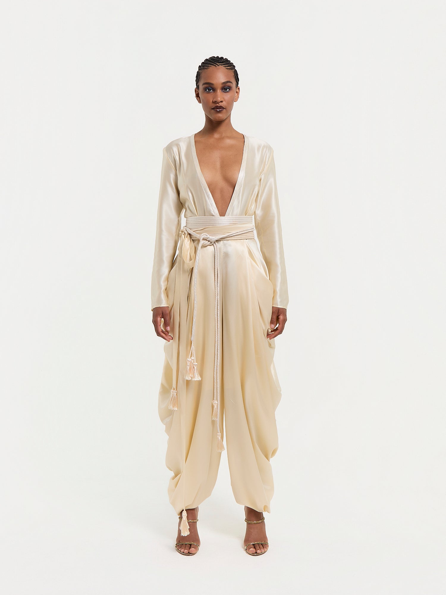 • Bias draped jumpsuit with V neckline and strong shoulders
