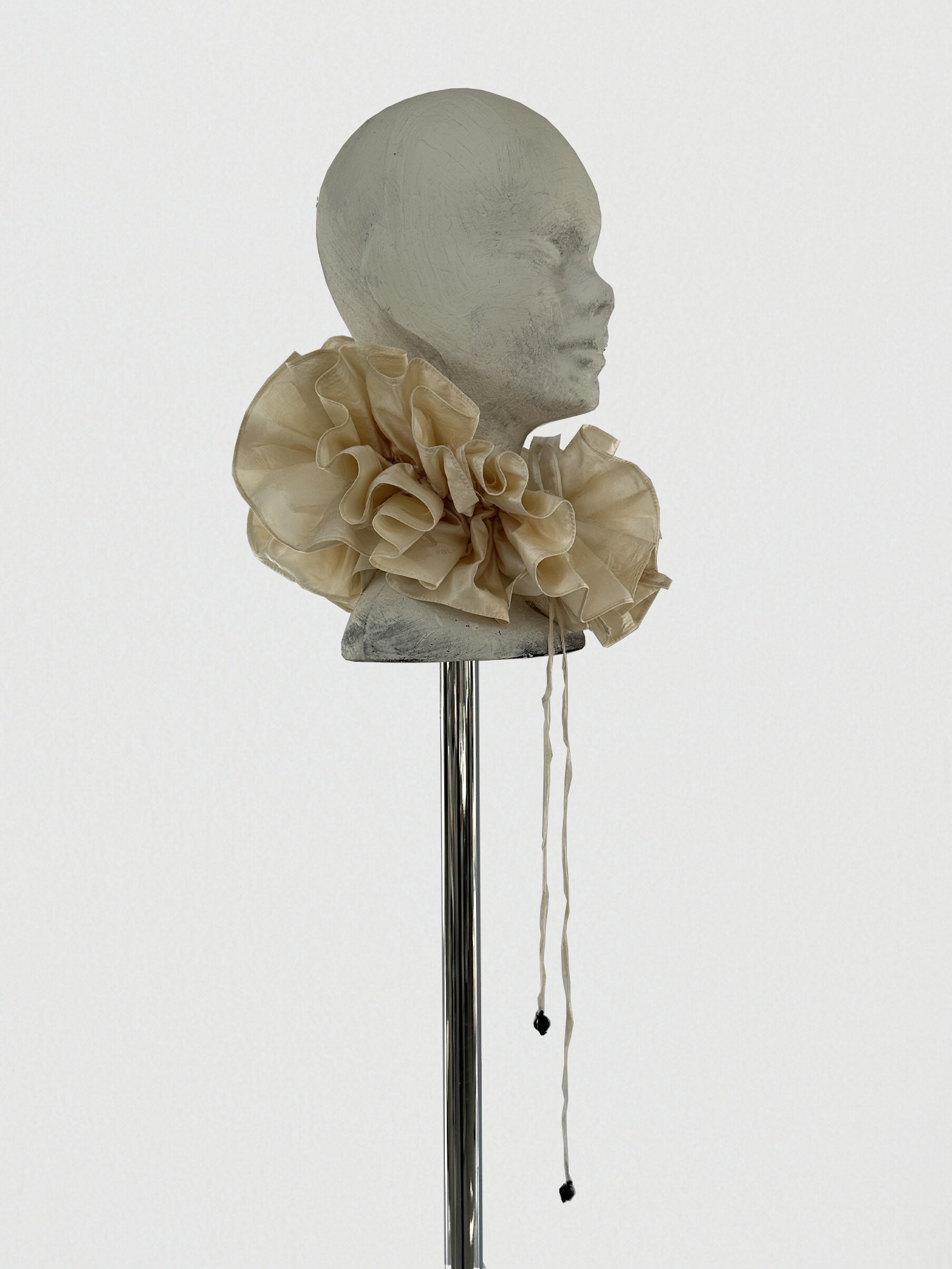 Frilly collar in champaign coloured silk, as one of our halloween special edition accessoires! Long ties finished with a black glass bead.