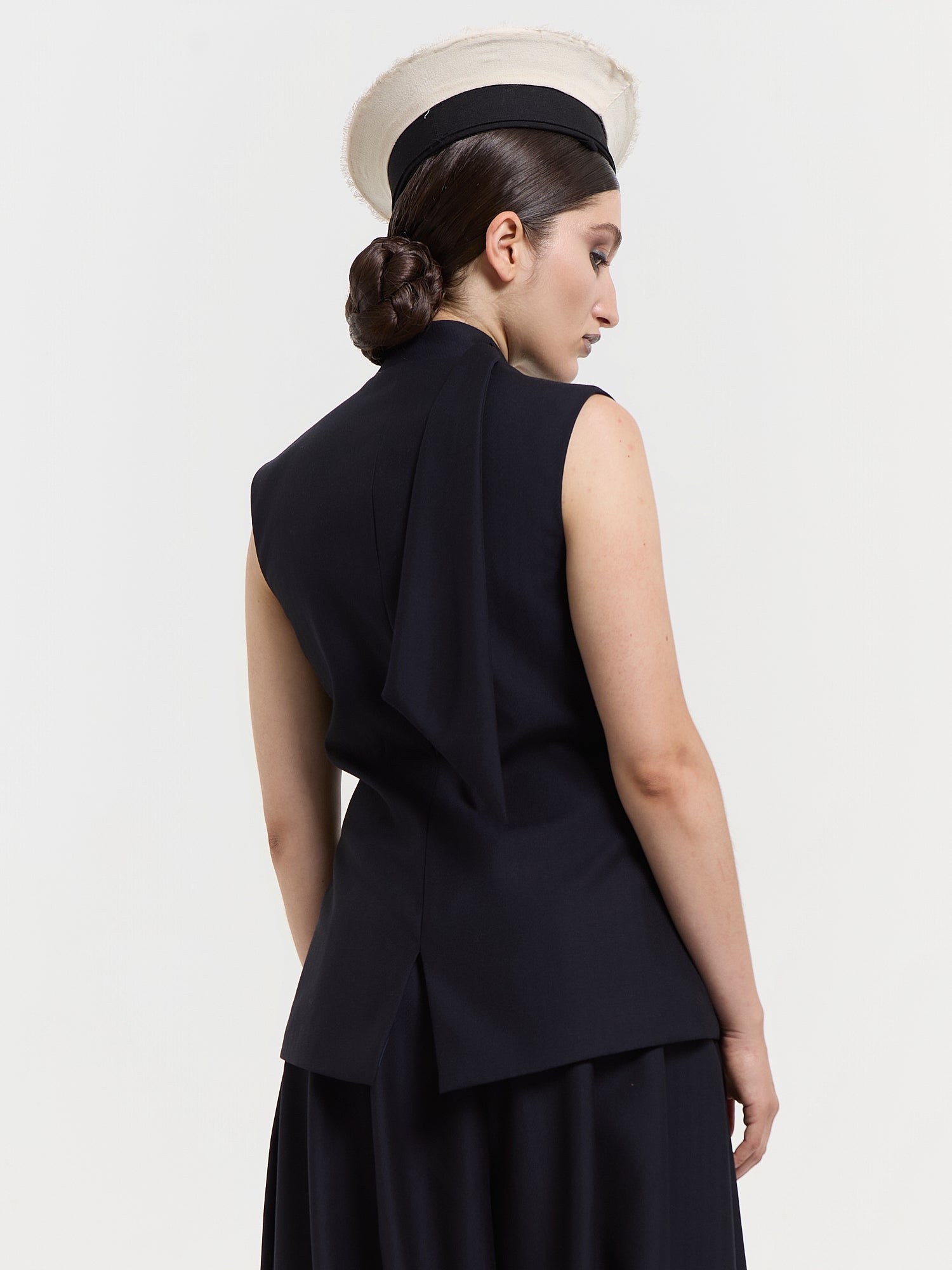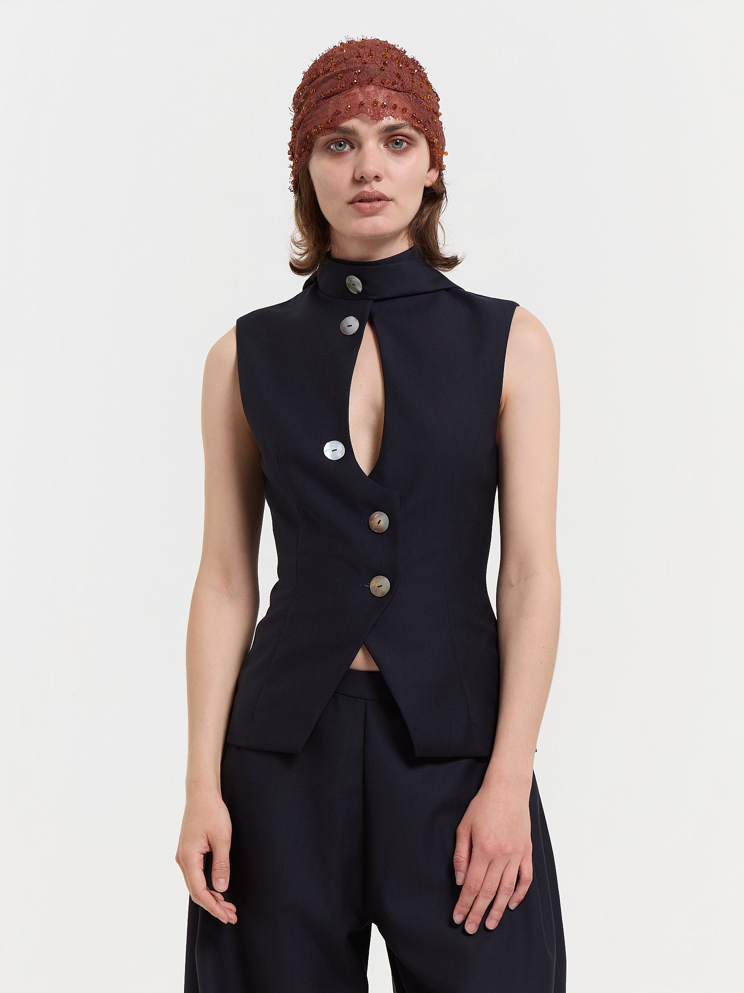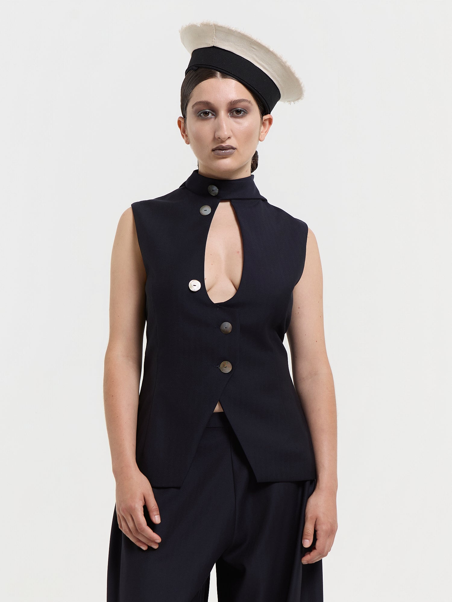 Marine blue wool waistcoat, can be paired with the balloon trousers.