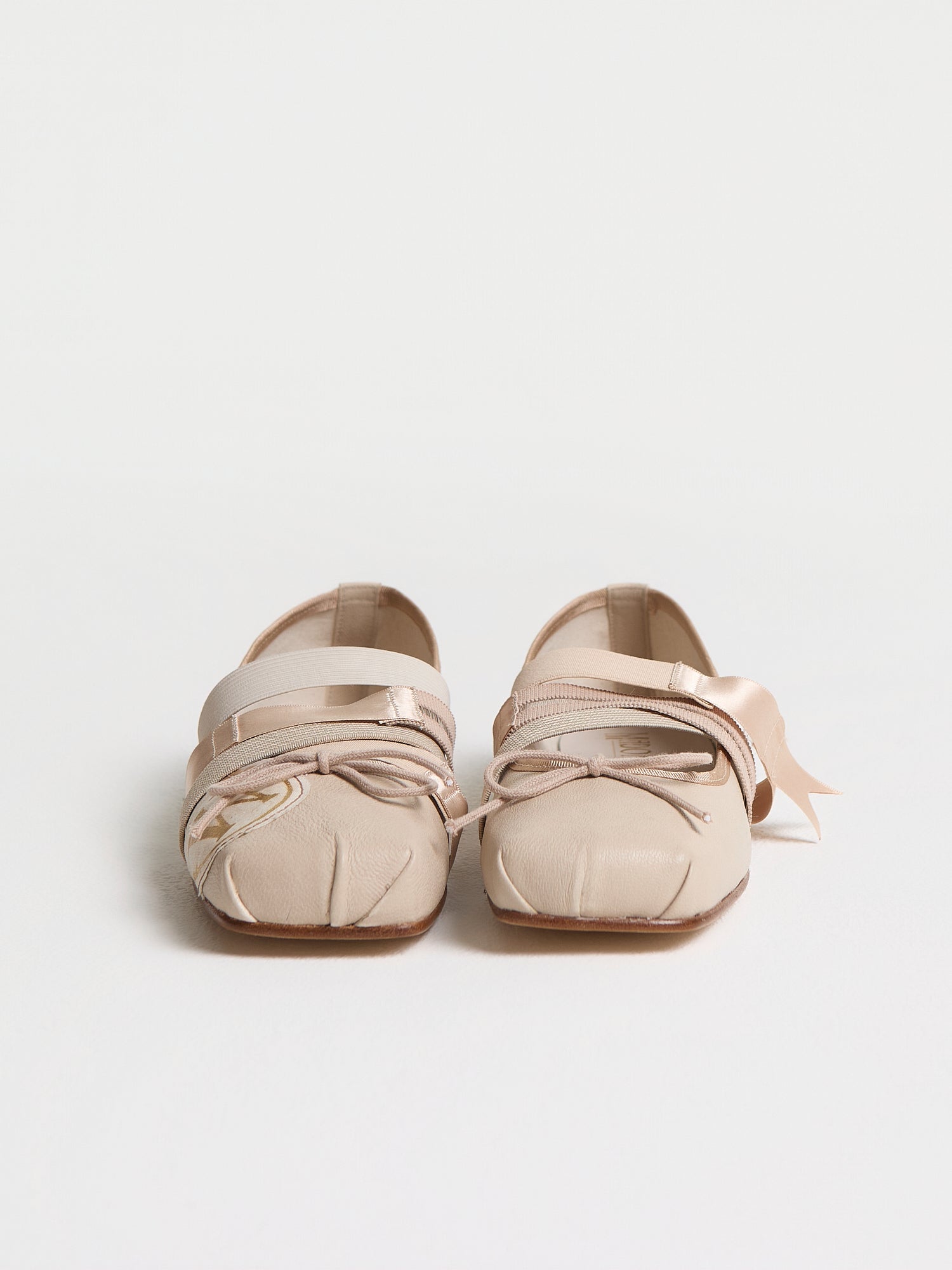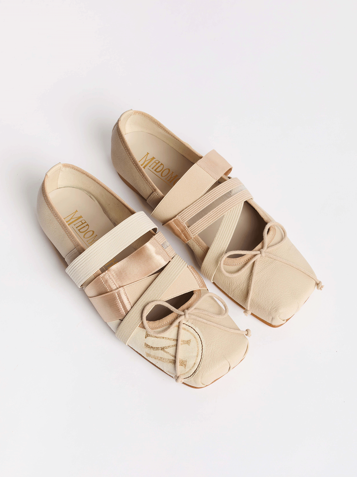 The Madomorpho Ballet Flats are inspired by ballet pointe shoes that are stored, with ribbons wrapped around the flats and have a decorative canvas sole stitched on.