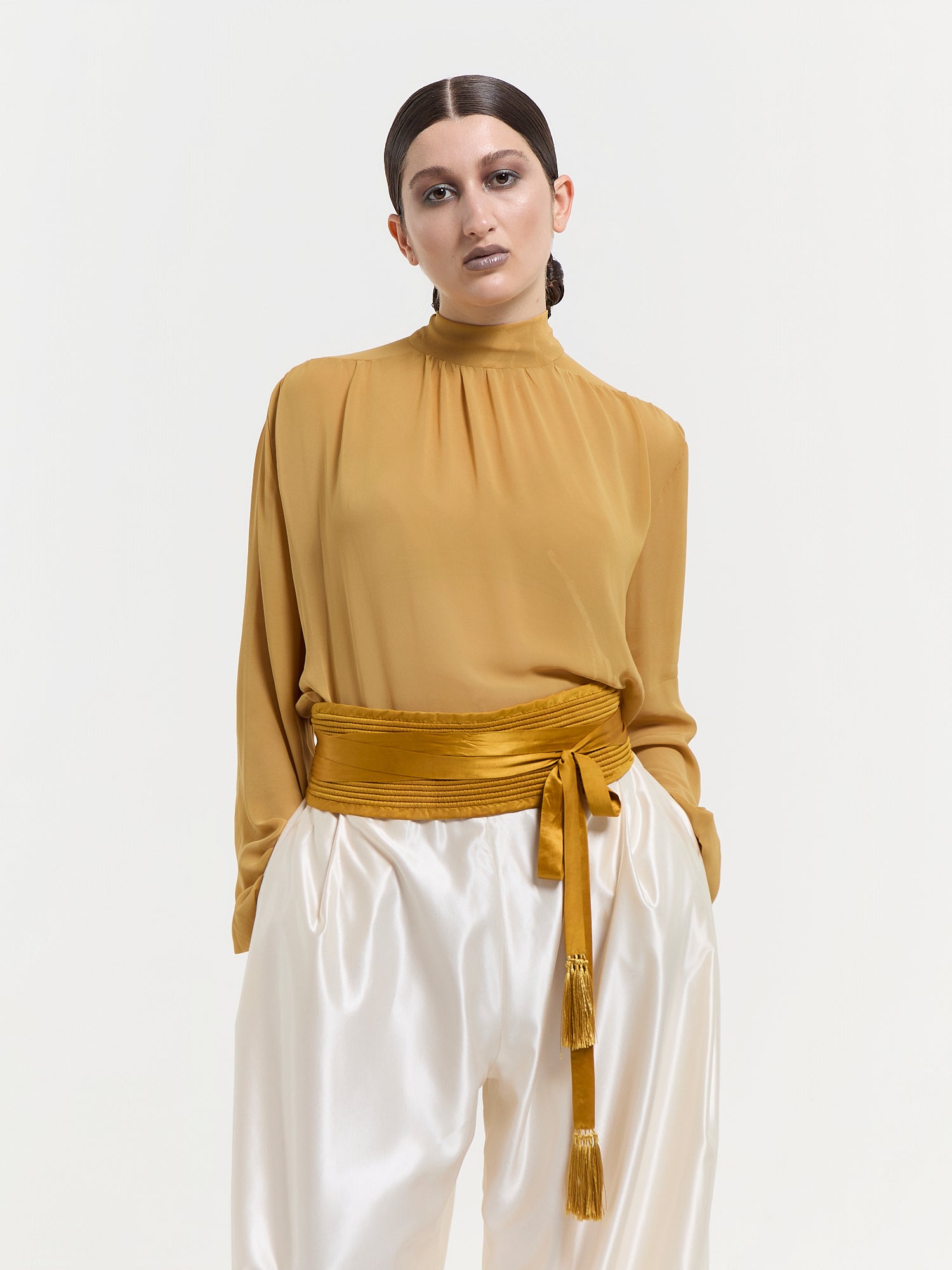 - • Gathered line from shoulder to shoulder, creating a strong silhouette
