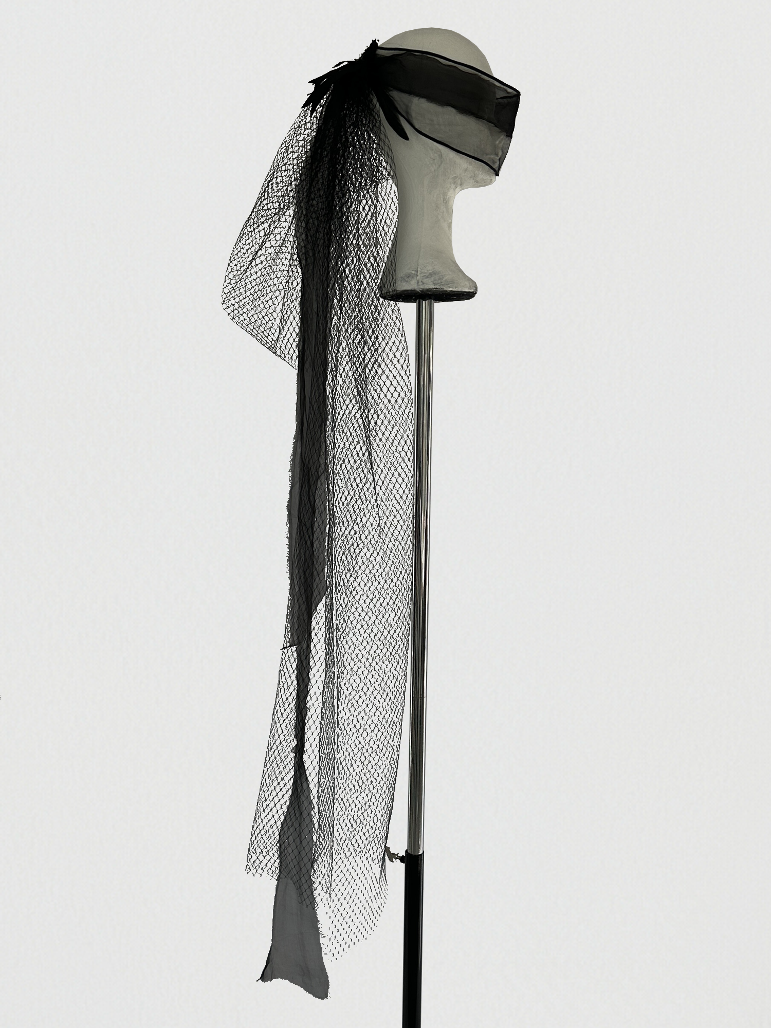 Mysterious mask with mesh, French tule and silk organza, which can be clipped in the back of your hair.